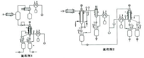 a)短程蒸餾器單級蒸餾單元: 經(jīng)預(yù)熱、脫氣后的物料進入短程蒸餾器,輕組份被蒸發(fā)并在內(nèi)置冷凝器上冷凝,它和重組份從不同的通道分別排出(流程圖1)。 b)刮膜蒸發(fā)器和短程蒸餾器組合蒸餾單元: 大量的低沸物在刮膜蒸發(fā)器里被除去,產(chǎn)品的蒸餾在后級的短程蒸餾器里產(chǎn)生(流程圖2)。 |